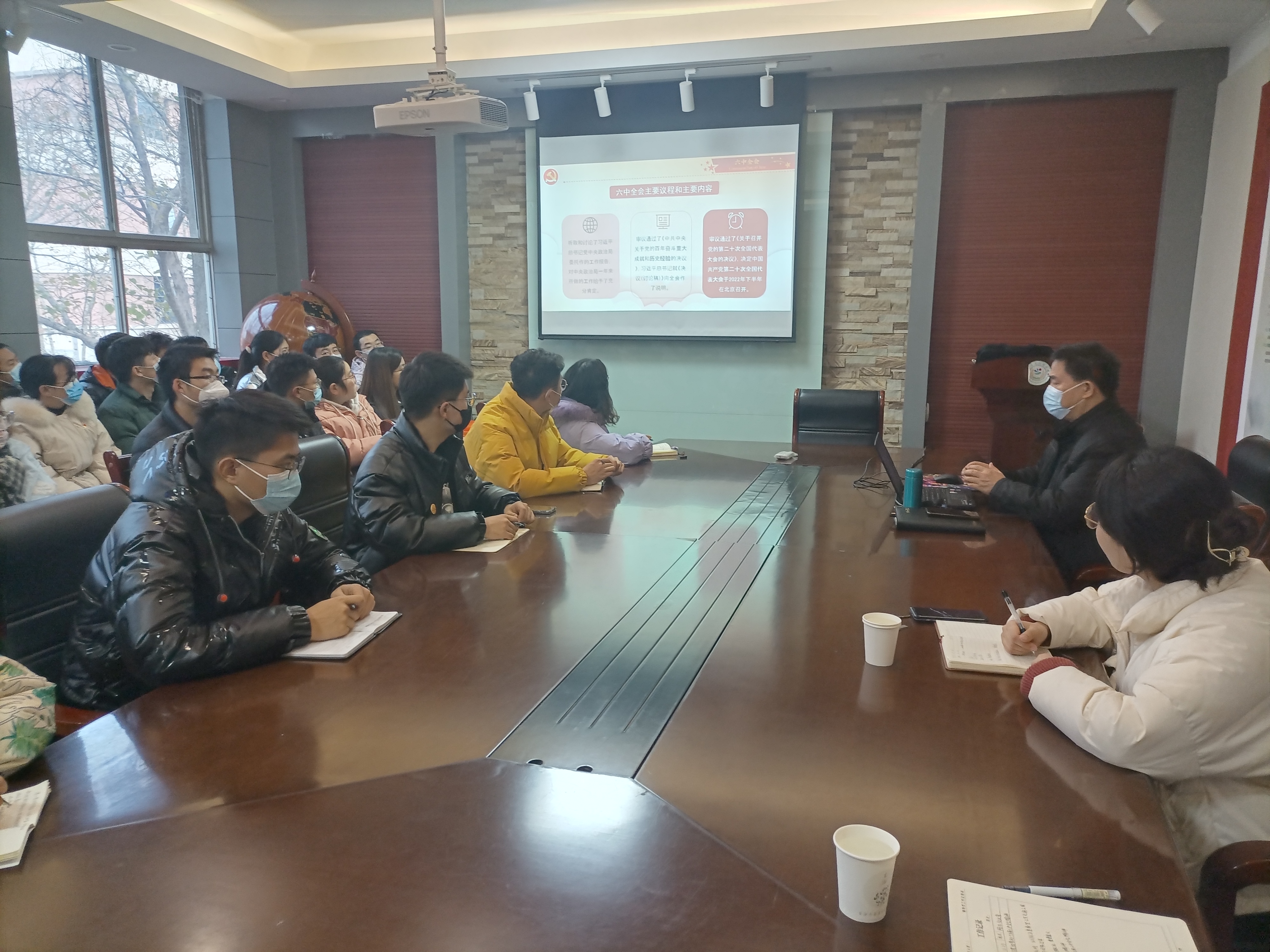 在文化路校区学院会议室举行学习贯彻党的十九届六中全会精神专题宣讲。本次宣讲由学院党委书记毕庆生主讲,院团委书记王岚主持,部分学生党员参加。
