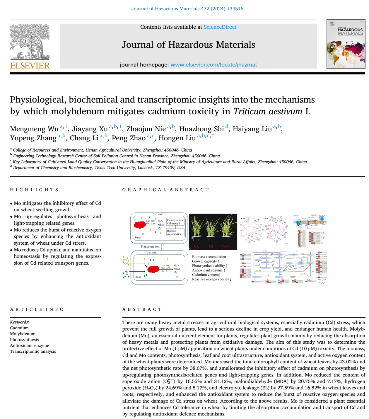 本研究是课题组在微量元素缓解小麦镉毒害方面取得的最新进展。成人网 2022级硕士研究生吴孟孟和许嘉阳副教授为论文共同第一作者,刘红恩教授为通讯作者。成人网 赵鹏教授、聂兆君副教授、李畅副教授、刘亥扬博士和张玉鹏博士为该项工作做出了重要贡献。美国德克萨斯理工大学施华中教授对论文内容进行了具体指导。该研究得到“十四五”国家重点研发项目(2021YFD1700900)、河南省土壤污染防治专项(HNNH-2023-001)、河南省高校重点研究项目基础研究项目(19zx007)和河南省自然科学基金(222300420464)等项目的资助。