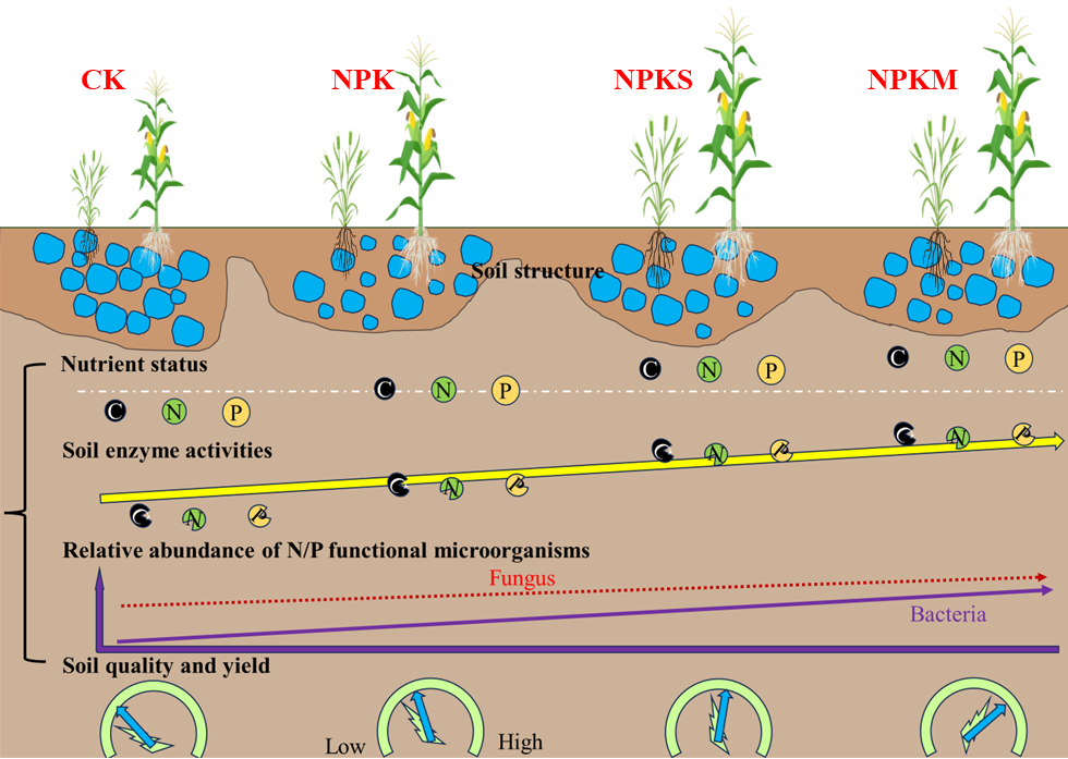 有机改良措施对减少矿物肥料依赖和提高农业废弃物资源利用至关重要。然而,关于秸秆/粪肥替代部分化肥对潮土土壤质量和微生物群落结构,特别是功能微生物群落与土壤质量关系的长期研究仍较为有限。通过长期监测站的数据监测与结果分析表明,秸秆和粪肥替代显著提高了功能性细菌群落(如Sphingomonas和MND1)和真菌群落(如Mortierella)的丰度,较NPK处理分别提高6.63%–7.81%、6.98%–9.22%和4.05%–12.2%。这些菌群与土壤质量和作物产量呈正相关,进而改善了土壤质量(提高12.6%–56.9%),提高了氮、磷肥的利用效率(NUE:4.11%–11.8%;PUE:3.32%–22.6%),并提高了作物产量(提高4.21%–12.7%)。粪肥替代部分化肥的效果优于秸秆。结构方程模型和主成分分析表明,土壤质量对功能性细菌群落的影响显著强于对真菌群落的影响。研究结果以“Improving soil quality and crop yield of ffuvo-aquic soils through long-term organic-inorganic fertilizer combination: Promoting microbial community optimization and nutrient utilization”为题,于2025年1月26日在线发表于《Environmental Technology & Innovation》。这些研究成果为优化农业管理实践、促进可持续农业发展提供了重要的科学依据,特别是潮土区。