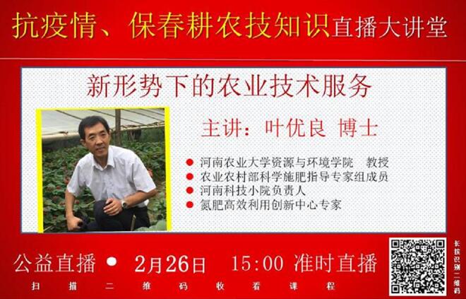 公益直播系列讲座包括“新形式下的农业技术服务”、“科学施肥、提质增效”、“小麦如何春季施肥”、“逆环境下的麦田栽培管理技术”,“花生常见病虫草害预防”、“大蒜如何春季施肥”等6集,单次播出时长为1个半小时左右。讲座时间为2月26-29日每天15点,2月29日19点,3月5日15点播出。叶优良教授的直播讲座得到了广大农户和基层农技人员的一致好评,做到防控生产两手抓、两不误、两推进。