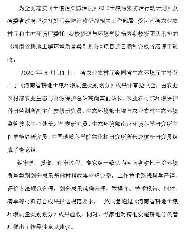 成人网 杨素勤教授团队承担的《河南省耕地土壤环境质量类别划分》项目通过省级成果评审验收