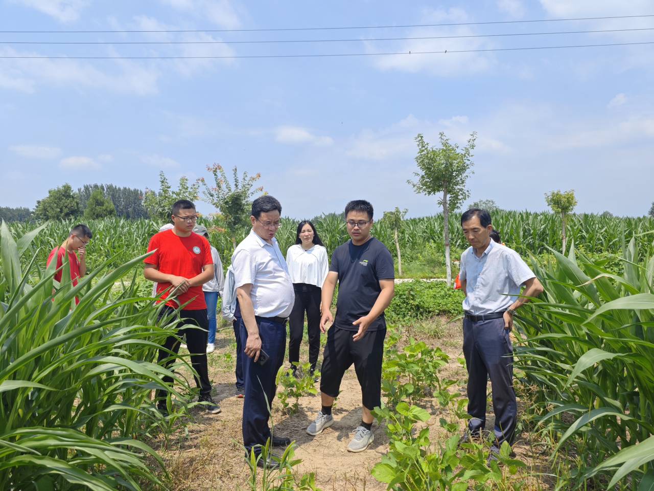 期间,领导老师先后参观兰考科技小院的生活区、助农直播间、农技培训讲堂、暑期支教班等,深入了解学生们的学习、生活及工作情况。座谈会上,学院领导听取了实践团队关于社会实践进展情况与收获,并与小院师生、许河乡政府人员就如何助力许河当地农业发展进行讨论交流。随后,大家一起到科技小院示范基地观察玉米生长情况,并合影留念。