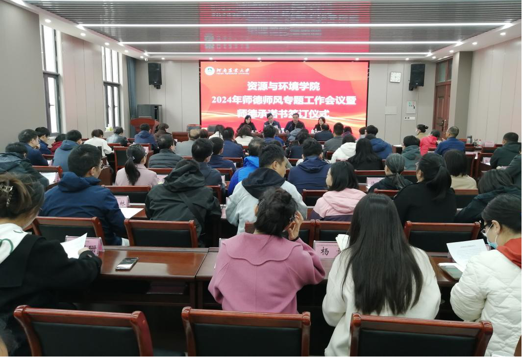 在力行楼中338报告厅开展2024年师德师风专题工作会议暨师德承诺书签订仪式。院领导班子成员和学院全体教师参加会议,会议由院长王宜伦主持。