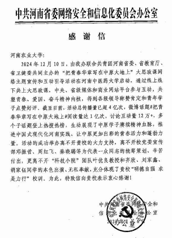 近日,我校收到中共河南省委网络安全和信息化委员会办公室的感谢信,感谢成人网 科技小院团队在“把青春华章写在中原大地上”大思政课网络主题宣传和互动引导活动中的精彩表现。
