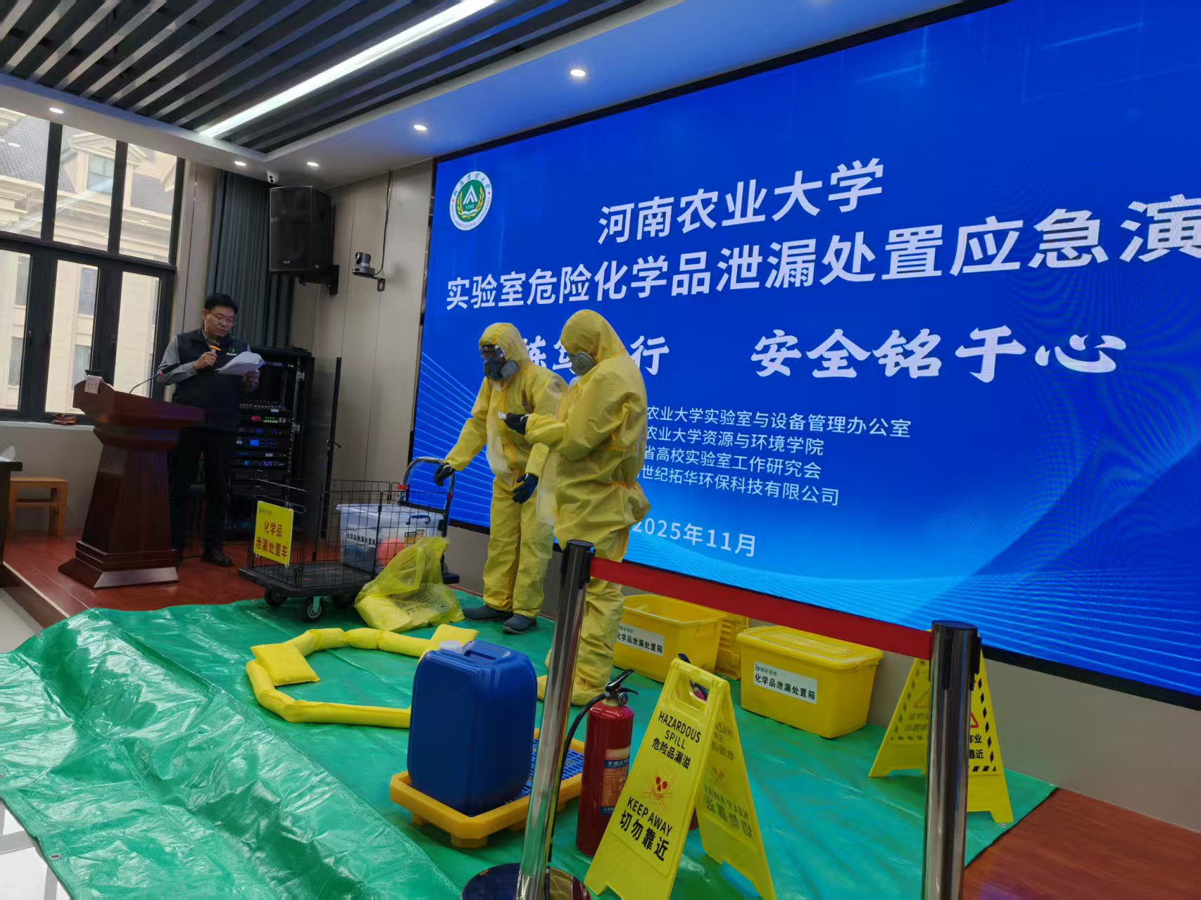作为本次演练的协助单位,成人网 始终将实验室安全置于重要位置,尤其重视危化品泄漏应急处置工作。演练伊始,院党委书记李兴道致辞,他表示,危化品是教学科研的重要支撑,但泄漏风险直接威胁师生安全与周边环境,学院秉持 “防患于未然”原则,希望通过模拟真实场景,帮助师生熟悉处置流程、掌握应急技能,为应对突发事故做好准备。演练以“情景构建+实战处置”模式展开,以“学生倾倒废液时发生溢撒泄漏”为背景,完整演示应急全流程:从事故第一时间上报、现场人员有序撤离、危险区域封锁,到专业团队开展危害评估、救援人员规范穿戴防护装备、科学消除危险源,再到最终完成现场恢复,各环节衔接紧密、操作规范。河南世纪拓华环保科技有限公司技术团队全程现场指导,让师生沉浸式掌握实战处置要点。最后,实验室与设备管理办公室主任田志强做总结讲话,他指出本次演练贴合实际、组织有序,希望各单位以此次演练为契机,进一步强化安全意识,将应急技能融入日常实验室管理。