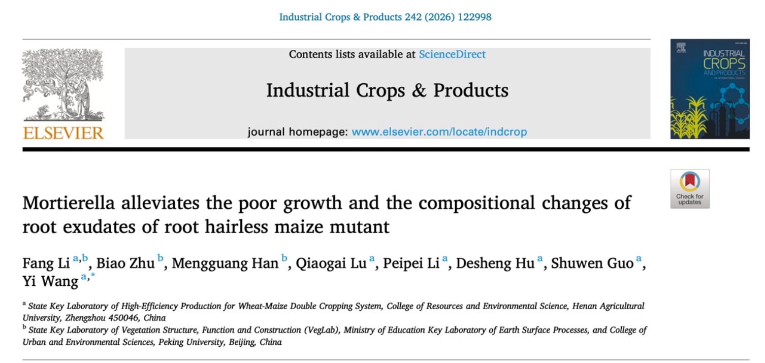 农田生产力绿色调控与功能性肥料团队的研究成果“Mortierella alleviates the poor growth and the compositional changes of root exudates of root hairless maize mutant”在作物领域国际著名期刊《Industrial Crops & Products》(中科院一区,IF 5.6)在线发表。该研究在田间条件下,整合微生物组、转录组与代谢组多组学技术,揭示了根际微生物对作物遗传缺陷的功能补偿机制,明确了被孢霉(