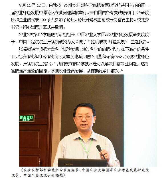 中国工程院院士张福锁教授 为第一届农业绿色发展中原论坛做报告
