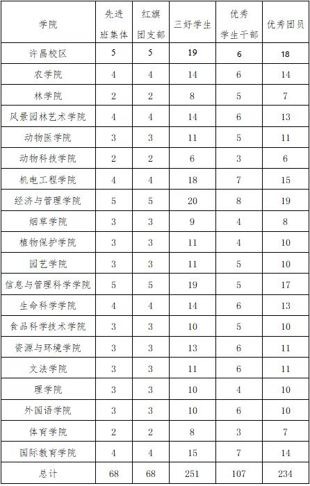 1.三好学生、优秀学生干部、优秀团员分为校、院两级。院级三好学生72人,院级优秀学生干部36人,院级优秀团员72人。校级三好学生13人,在院级三好学生中产生;校级优秀学生干部6人,在院级优秀学生干部中产生;校级优秀团员11人,在院级优秀团员中产生。